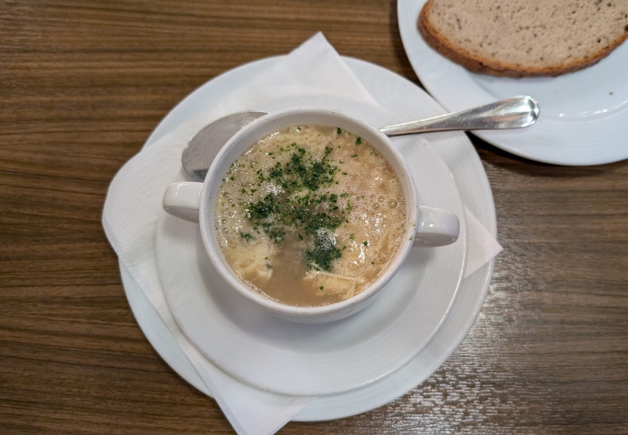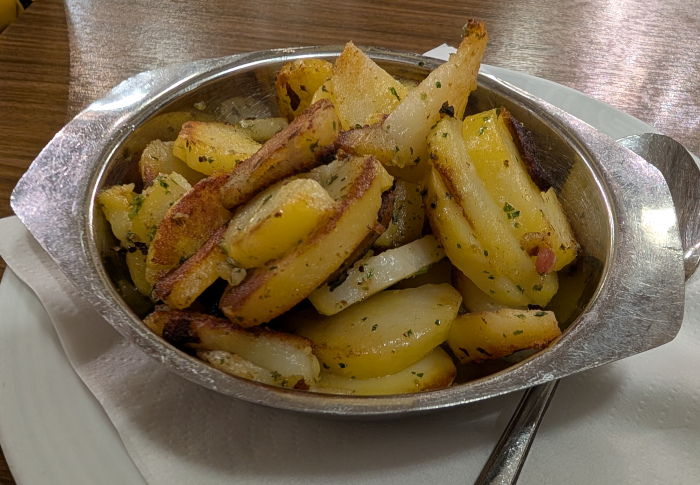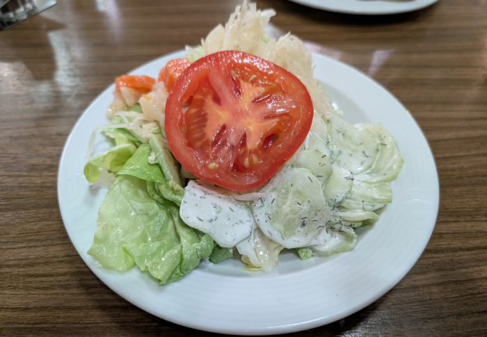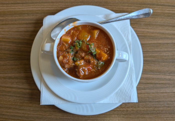 Die Speisekarte schließlich gibt sich konsequent gut bürgerlich-konservativ: hausgemachte Suppen, Schnitzel, Variationen von der gebratenen Kuh, Wild, Rhön-Forelle und andere Fischlein, Schmorgerichte, ein wenig vegetarisches Zeugs, Schlachteplatten aus der hauseigenen Metzgerei, dazu eine solide Vesperkarte, keine Salatkarte und keine zeitgeistigen Kniefälle wie Burger, Pizzen, Bowls oder Halal. Das ist „Futtern wie bei Muttern“ oder Futtern wie in den Siebzigern. Muss ja nicht schlecht sein. Die Küchenleistung ist jedes Mal verlässlich-solide, kulinarische Highlights oder Innovationen bleiben ebenso aus wie bittere Enttäuschungen. Die Portionen sind weniger für sesselpupsende Stadtfräcke als vielmehr für eine körperlich hart arbeitende Landbevölkerung ausgelegt. Positiv sind auch die Küchenöffnungszeiten täglich durchgehend von 11 bis 21 Uhr, für Hausgäste bei Anmeldung sogar bis 23 Uhr: hier richtet sich ein Wirt nach den Bedürfnissen seiner Gäste und nicht die Gäste nach den ökonomischen Regeln des Wirtes. Ich sehe ja ein, wenn ein Wirt von 14 bis 17 Uhr seine Küche zusperrt oder gleich nur abends öffnet, wenn die Gaststube zu Randzeiten gähnend leer bleibt, aber im Biber sorgt die Gäste-Mischung aus Geschäftsreisenden, Einheimischen und Sommerfrischlern für eine kritische Masse, die eine ganztätige Bewirtschaftung erst lukrativ macht. Das Personal ist durch die Bank weg freundlich und aufmerksam. Das kleine Frühstücksbuffet schließlich ist nicht überbordend, aber gut sortiert und reicht, um des morgens trefflich wach und satt zu werden.